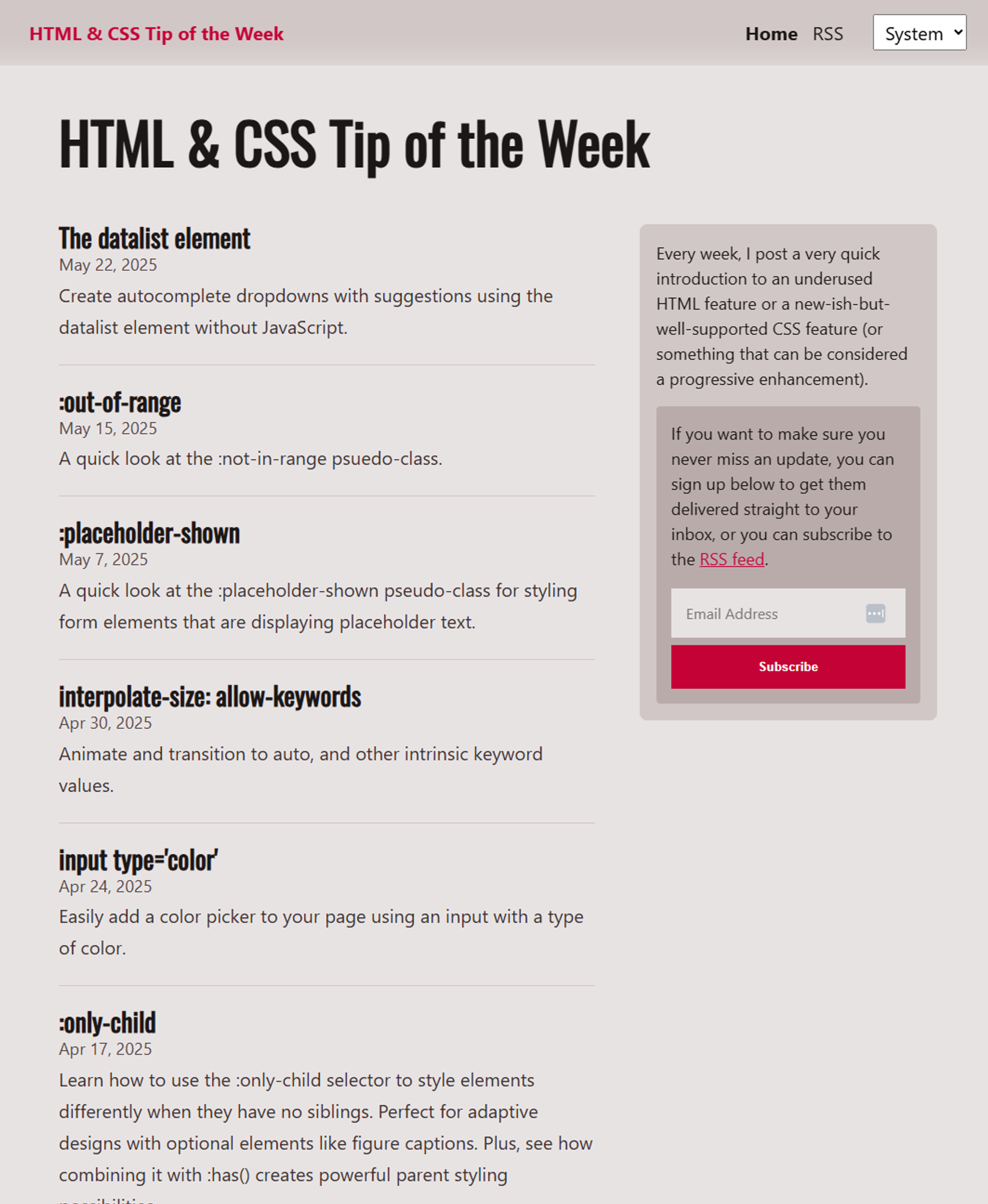 In January this year (2025), Kevin Powell released his website HTML & CSS Tip of the Week, and God dammit it's good! It's everything I wanted this collection of posts to be.
